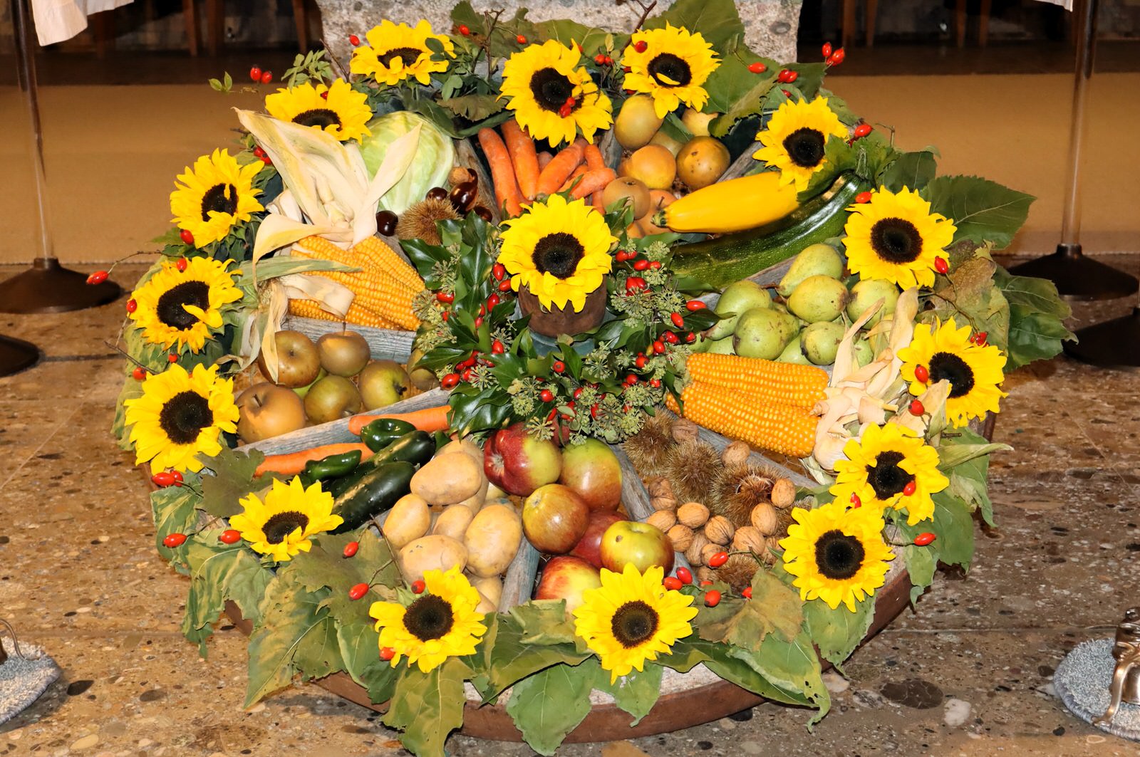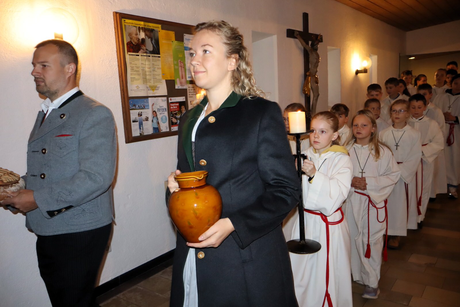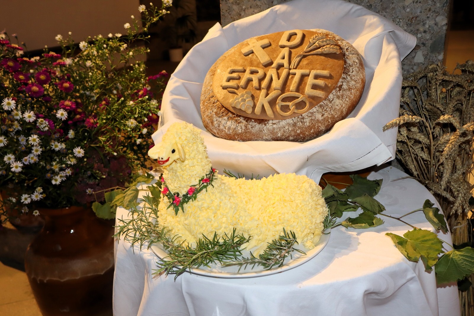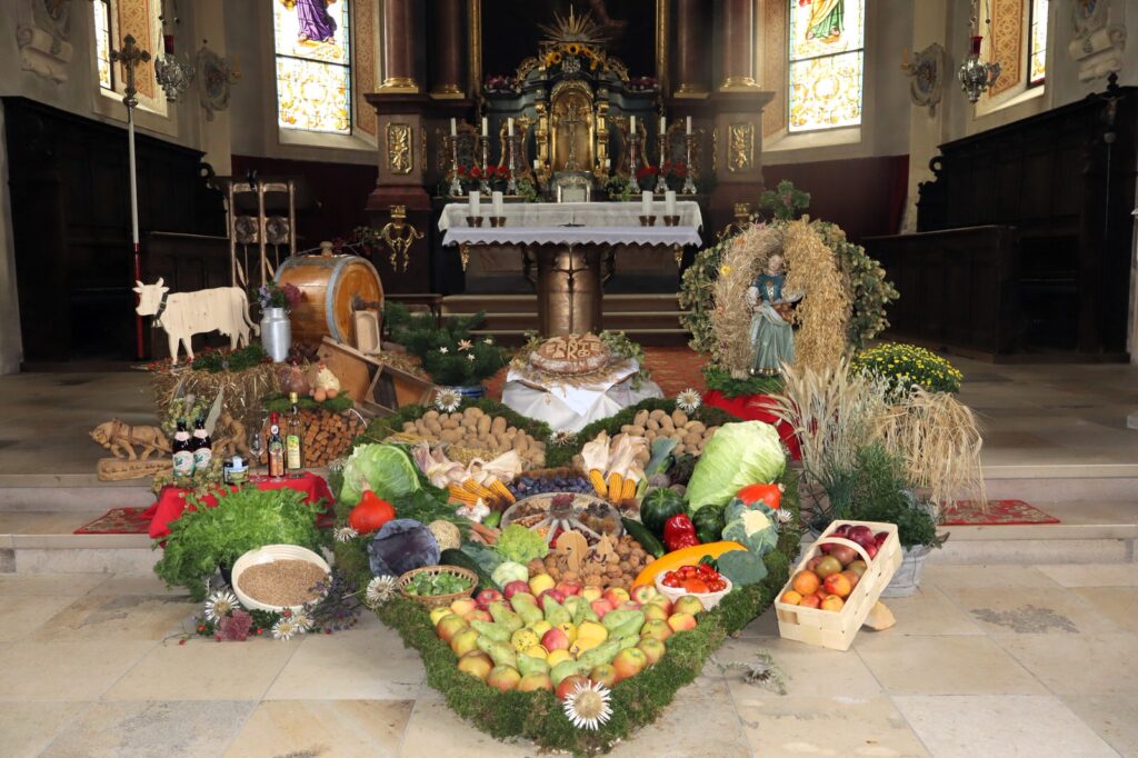 Nach guten Brauch hatten fleißige Frauen und Mitglieder beider Pfarreien die Altarräume mit prachtvollen Aufbauten dekoriert und geschmückt. Sie spiegelten sichtbare Zeichen an Dankbarkeit für die Gaben, an denen die „Mitarbeiter Gottes“ mit ihrer Hände Fleiß arbeiteten. Ergebnisse waren all die Früchte, welche Gott durch seinen Gnade wachsen und gedeihen ließ. Für ein besonders schönes Kunstwerk sorgte Maria Stadler, die aus inniger Dankbarkeit und zur Ehre Gottes, anlässlich ihres 90. Wiegenfestes ein kunstvolles Lamm aus reiner Butter anfertigte und vorm Altar zusammen mit Brot und Wein, heuer getragen vom frisch vermählten Brautpaar Florian und Stephanie Gschwendtner präsentierte.