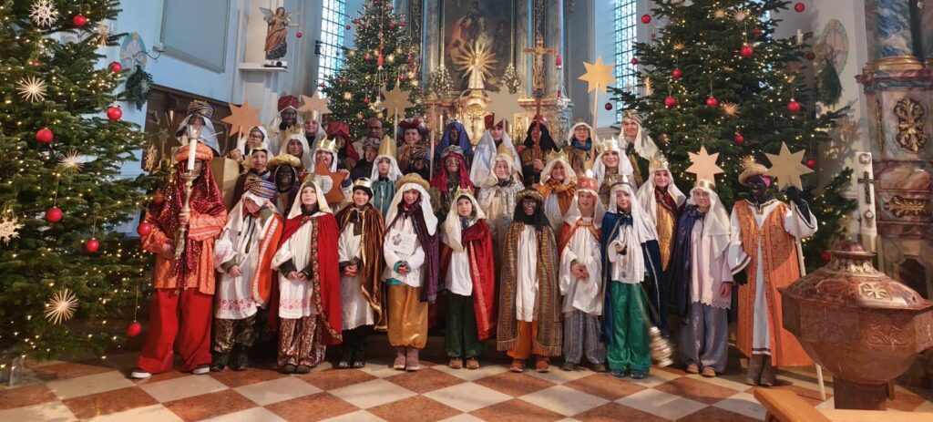 Am Silvestertag begrüßte Pfarrvikar Pater John 35 Wissenschaftler, Schriftgelehrte und Könige aus dem Morgenland, Afrika und Asien in der Pfarrkirche St. Martin in Au bei Bad Aibling. Zum Aussendungsgottesdienst für die diesjährige Dreikönigsaktion der Sternsinger, des Kindermissionswerk vom Bund der Deutschen Katholischen Jugend. Pater John flocht in seiner Ansprache eine Verbindung, dass die Mädchen und Buben, die hier mitwirken, stellvertretend stehen für die Weisen und Könige, die damals nach der Geburt Jesu vor über 2000 Jahren nach Betlehem gezogen sind. Nach der Segnung der 35 Kinder die heuer an der Aktion teilnehmen, bedankte sich Pater John bei allen die auch heuer wieder mitwirken. Ob Sternsinger selbst, betreuende Mütter und Bastler von Sternen und der aufwändigen Verkleidung. Die Kinder sammeln nicht nur für den guten Zweck in der Sternsingeraktion, die heuer unter dem Motto „Gegen Kinderarbeit – Schule statt Fabrik“ steht. Sondern Sie bringen auch den Segen Gottes und die frohe Kunde der Geburt von Christus in die Haushalte im Dorf.